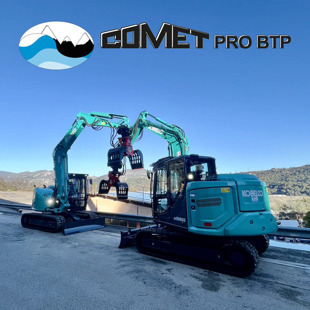 Les nouvelles pelles KOBELCO sont là ! Les Kobelco SK85MSR-7 sont pensées pour maximiser la productivité sur les chantiers urbains et les espaces restreints. Son rayon de rotation court permet de travailler efficacement sans compromis sur la puissance. Équipées de deux pinces MBI elles assurent un travail efficace ! Dotée d’un moteur de 53,7 kW et d’une force d’excavation élevée, elle assure des performances solides pour tous types de travaux. Force et confort pour vos chauffeurs Technologie et sécurité sont également au rendez-vous avec une cabine de luxe équipée d’un écran et de systèmes intelligents pour faciliter le quotidien des opérateurs. Climatisation, rétroéclairage LED et un siège à suspension pour un confort hors pair pour vos chauffeurs. Grâce à une force d’excavation de 60,3 kN, la machine garantit des performances constantes, même dans les conditions les plus exigeantes. Contactez nous pour les conseils de nos professionnels ! Accéder à la page partenaire COMET PRO BTP