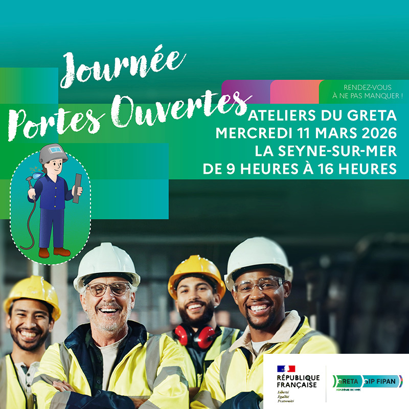 La journée portes ouvertes du GRETA GIP FIPAN Le GRETA GIP FIPAN a le plaisir de vous informer de l’organisation de notre journée portes ouvertes consacrée aux métiers du bâtiment et de l’industrie, sur notre site des Ateliers du GRETA à La Seyne sur Mer. Ouverte au grand public, cette journée permettra de découvrir nos formations, nos plateaux techniques et d’échanger avec nos équipes et apprenants. Nous serions heureux de vous accueillir à cette occasion et vous remercions par avance de bien vouloir relayer cette information auprès de vos publics et réseaux afin d’en favoriser la diffusion. Retrouvez nous prochainement Mercredi 11 Mars de 9h à 16h           Les Ateliers du GRETA 117 avenue Marcel Berre – LA SEYNE SUR MER         06 40 16 36 60 Accédez à la page partenaire GRETA GIF FIPAN