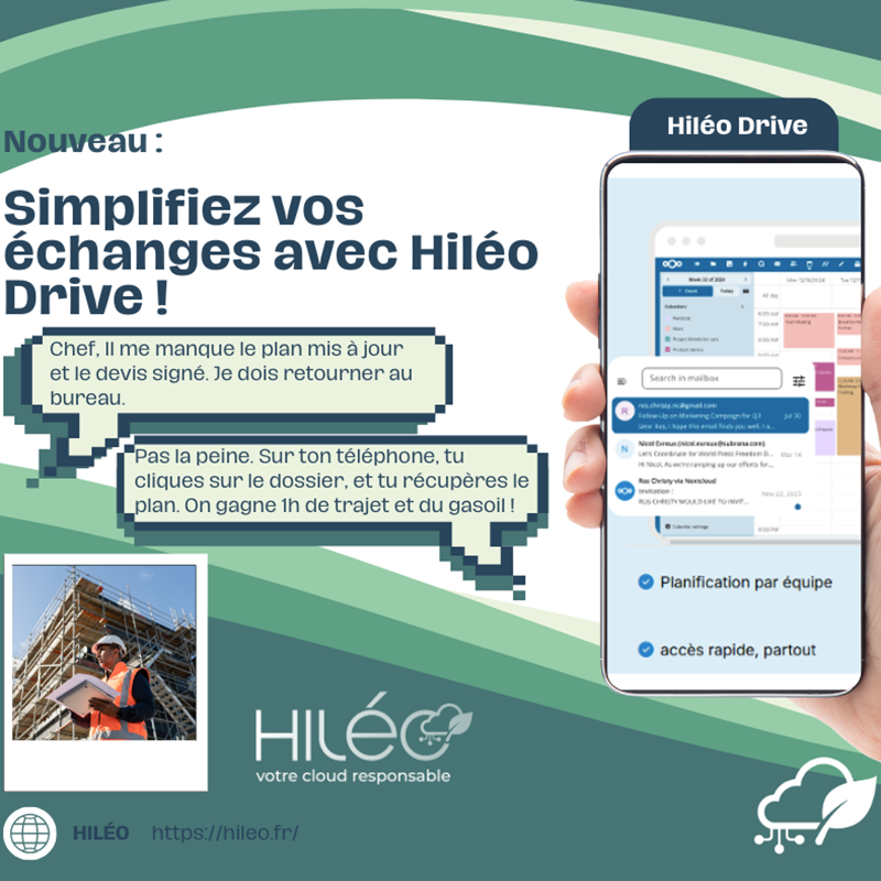 Simplifiez vos échanges avec Hiléo Drive ! Découvrez Hiléo Drive, notre nouvelle solution souveraine (technologie Nextcloud) conçue pour les pros du bâtiment. Bien plus qu’un simple stockage pour vos plans et photos, c’est un véritable bureau virtuel, personnalisé, qui centralise vos échanges. Gagnez en efficacité grâce à une suite d’outils complète : discutez en temps réel avec vos équipes via le Chat sécurisé, organisez vos plannings de chantier grâce au calendrier partagé, et envoyez vos documents lourds en un clic. Avec Hiléo Drive, tout est au même endroit, accessible partout, tout en garantissant la confidentialité totale de vos données. L’outil idéal, pour sécuriser votre patrimoine numérique et fluidifier votre quotidien. Accédez à la page partenaire Hiléo